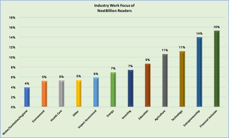 The next question produced a few surprises: When asked what industry their work primarily focuses on, financial inclusion led the way, followed closely by entrepreneurship. Technology and agriculture also scored highly. These results could help shape our coverage in the coming year: NextBillion already has a strong focus on financial inclusion (with a sub-site dedicated to the sector), and entrepreneurship is an element of practically everything we publish. But in light of these responses, we’ll be looking to ramp up our coverage of technology and agriculture – perhaps through special series and sub-sites. And we’ll likely retire our current sub-site dedicated to health care – though we’ll certainly continue to follow and cover the sector on a regular basis.