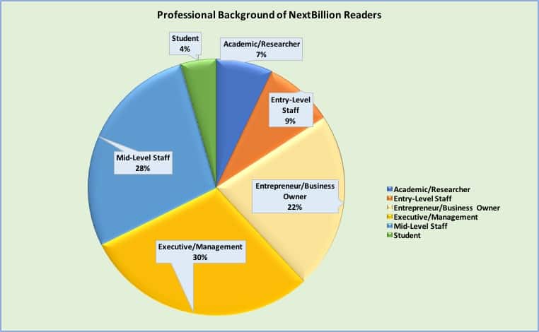 We were also a bit surprised by the response to our question about readers’ professional background. It turns out that over half of our readers are either executives/managers at their organizations (30 percent), or entrepreneurs who own their own businesses (22 percent). We’ve long had the sense that NextBillion reaches many decision-makers in emerging markets business – this survey seems to confirm it.