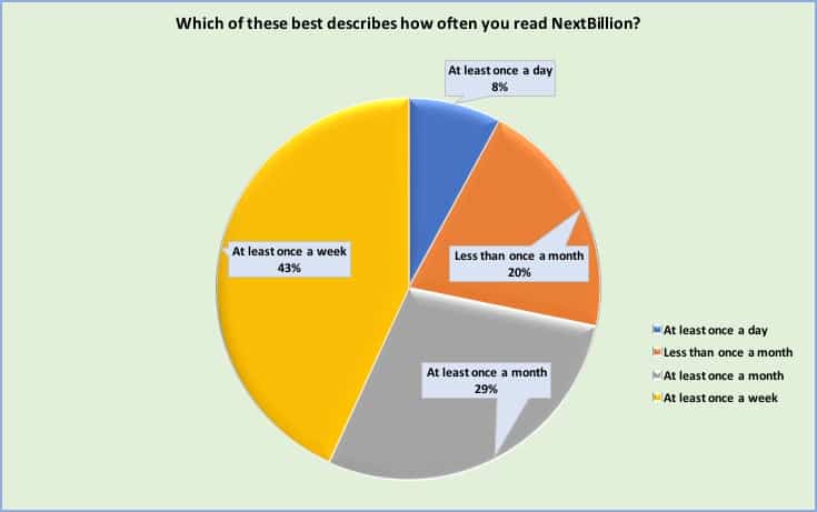 We were a little apprehensive about asking how often readers visit the site: No publication wants to discover that its readers are disengaged. But we were happy to see that a majority of NextBillion readers visit the site regularly: 43 percent at least once per week, and 8 percent at least once per day. Our challenge, based on these numbers, is to try to bring the rest of our readers – particularly the 29 percent who visit at least once a month – into more regular contact with the site. In the coming months, we’ll be experimenting with a number of approaches, focused on both site content and promotion.