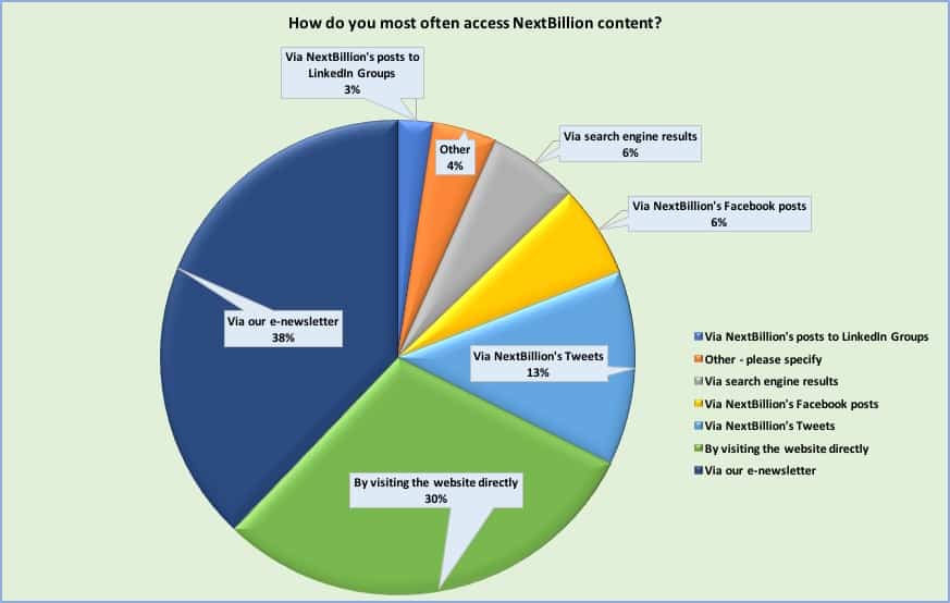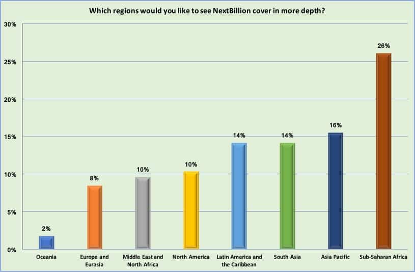 There’s one big takeaway from our question about how readers access the site: Our newsletter, NextBillion Notes, is key, with almost 40 percent reporting it as their main avenue to our content. We’ll be rolling out some new approaches to design and reader engagement in our newsletter in the coming weeks. If you’re not already subscribed, sign up here.