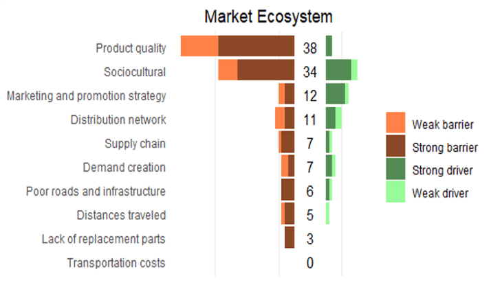 Count of papers reviewed that mention market ecosystem factors as drivers or barriers of off-grid solar uptake.
