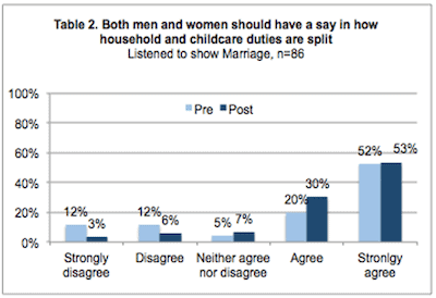 The shows increased interaction on the distribution of chores: 52% of survey respondents discussed the content with someone else, primarily their husbands, but also with their children, mothers-in-law and friends/neighbours.