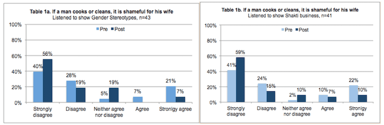 Listening to the show with their husbands, and having interactions with their close social networks (husbands, friends) may have helped influence entrepreneurs’ beliefs here. Also, after listening to the show on marriage, 72% agreed that households will be more successful if both men and women share the household and childcare duties more equitably, compared to 65% who agreed to this statement before listening to that program.